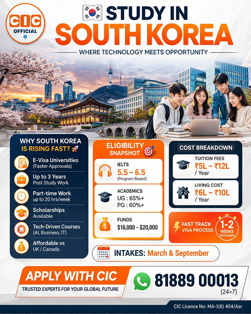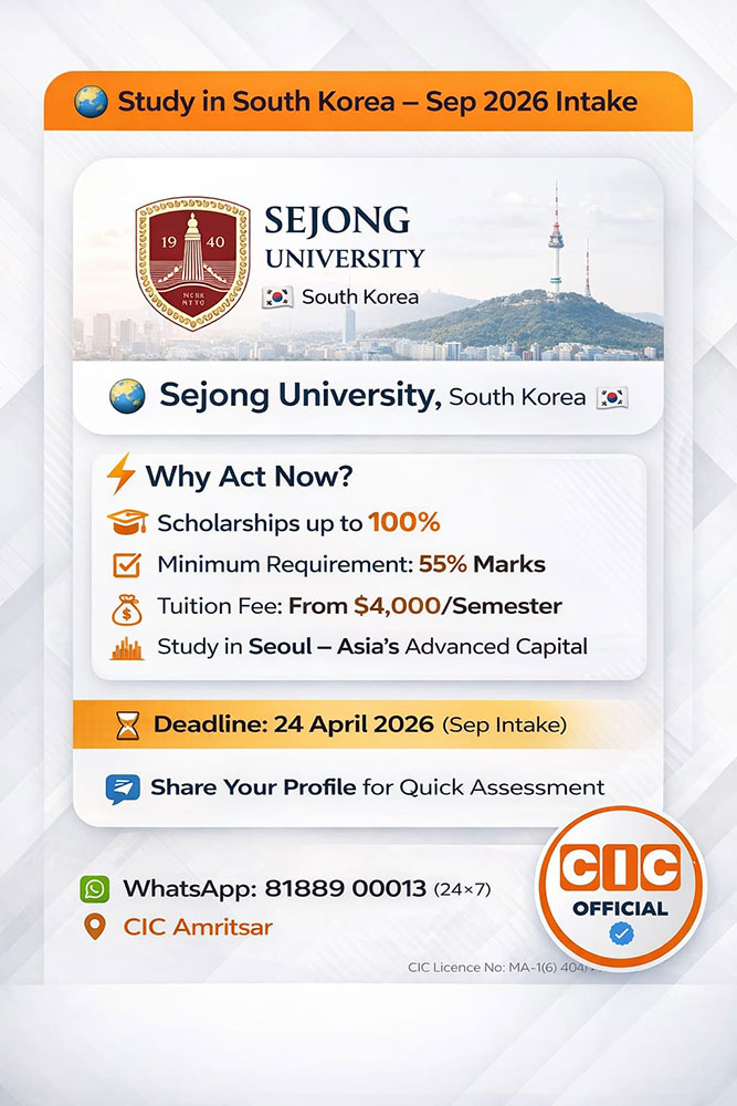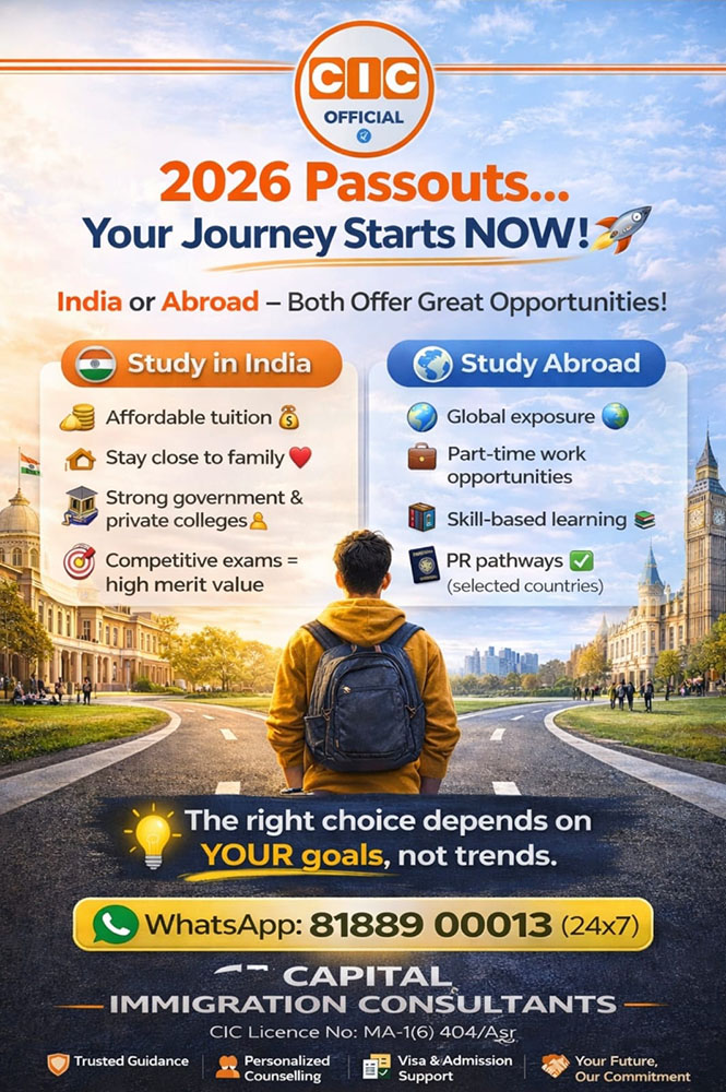 CIC is a trusted study abroad and medical admissions consultancy, headquartered in the heart of the historic city of Amritsar, Punjab. Established on 9th December 2013, CIC was founded with a clear and transparent vision โ to provide honest, reliable, and student-focused guidance to individuals aspiring to build their careers in India and abroad.