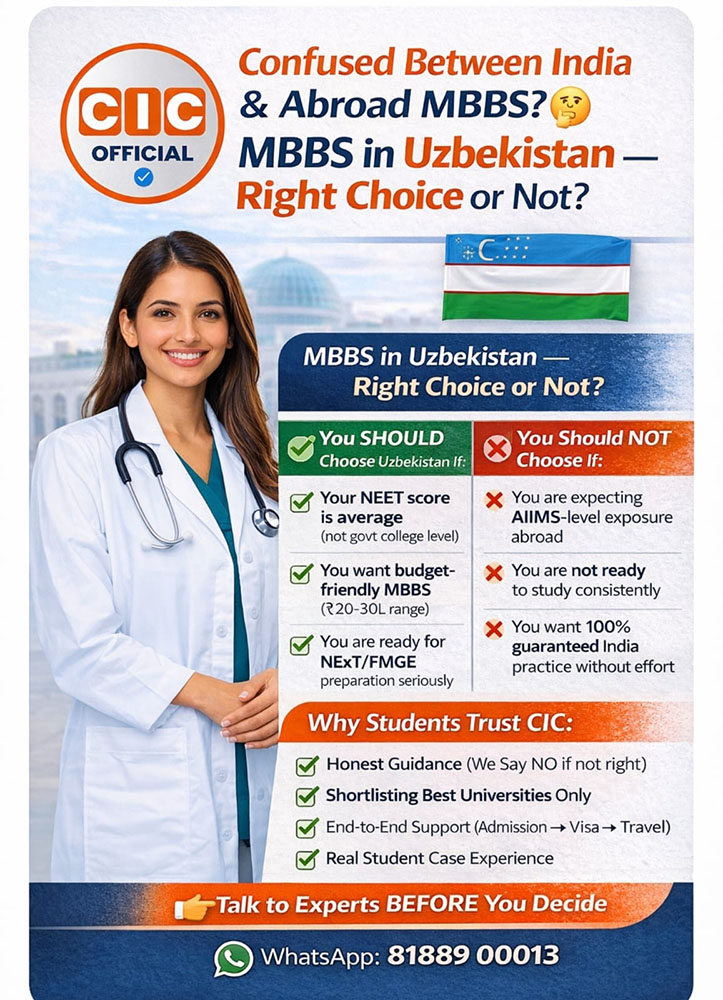 With over 12+ years of experience, CIC has successfully guided thousands of students for study abroad programs and MBBS admissions, offering end-to-end counselling and support at every stage of the application and visa process.