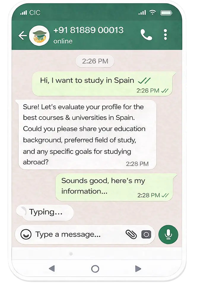 Get a clear estimate of the total cost of studying in Spain, including tuition fees and living expenses. CIC provides complete financial guidance to help you plan your study abroad journey with confidence.
